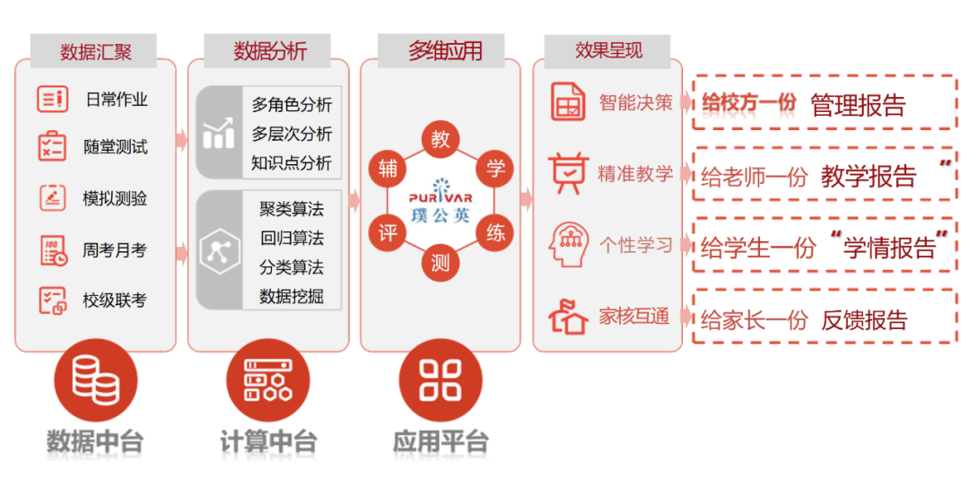 依托教育大数据阐发取聚类、回归等核默算法,建立组卷、阅卷、学情诊断、讲堂讲评、家校互联的全流程办事系统。帮力建立智能精准教研重生态。
